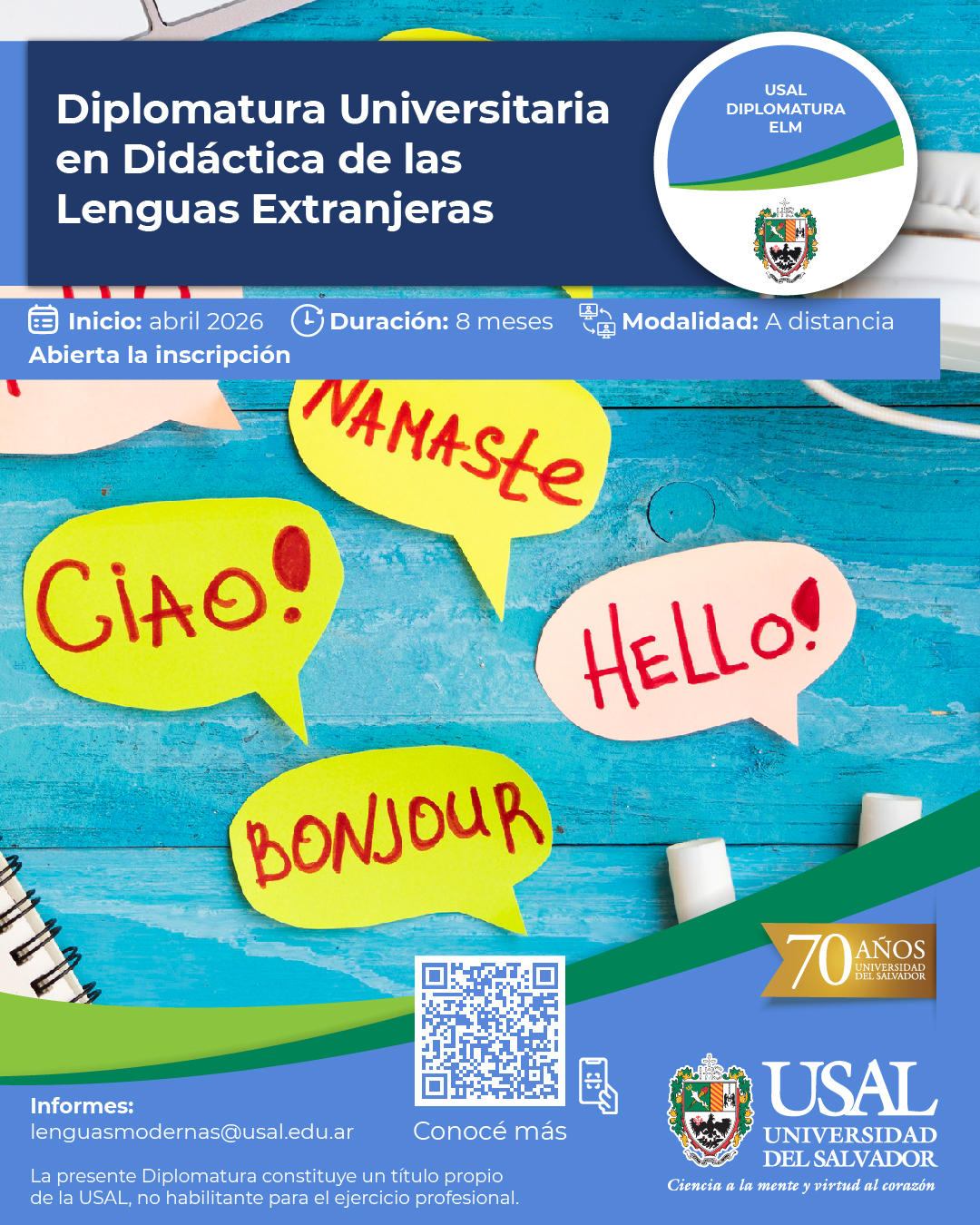 La Escuela de Lenguas Modernas presenta este nueva propuesta de formación específica, la Diplomatura Universitaria en Didáctica de las Lenguas Extranjeras. Este trayecto de formación apunta a brindar un espacio de formación básica y actualizada a todos aquellos interesados en la enseñanza de idiomas a adultos en el ámbito privado que tengan escasa o nula experiencia, y a aquellos que ya cuentan con experiencia pero no poseen formación docente. Esta propuesta está especialmente dirigida a quienes quieran adquirir saberes básicos en estrategias de enseñanza, evaluación de los aprendizajes, diseño de cursos y materiales, y manejo de nuevas tecnologías aplicadas a la enseñanza de idiomas.